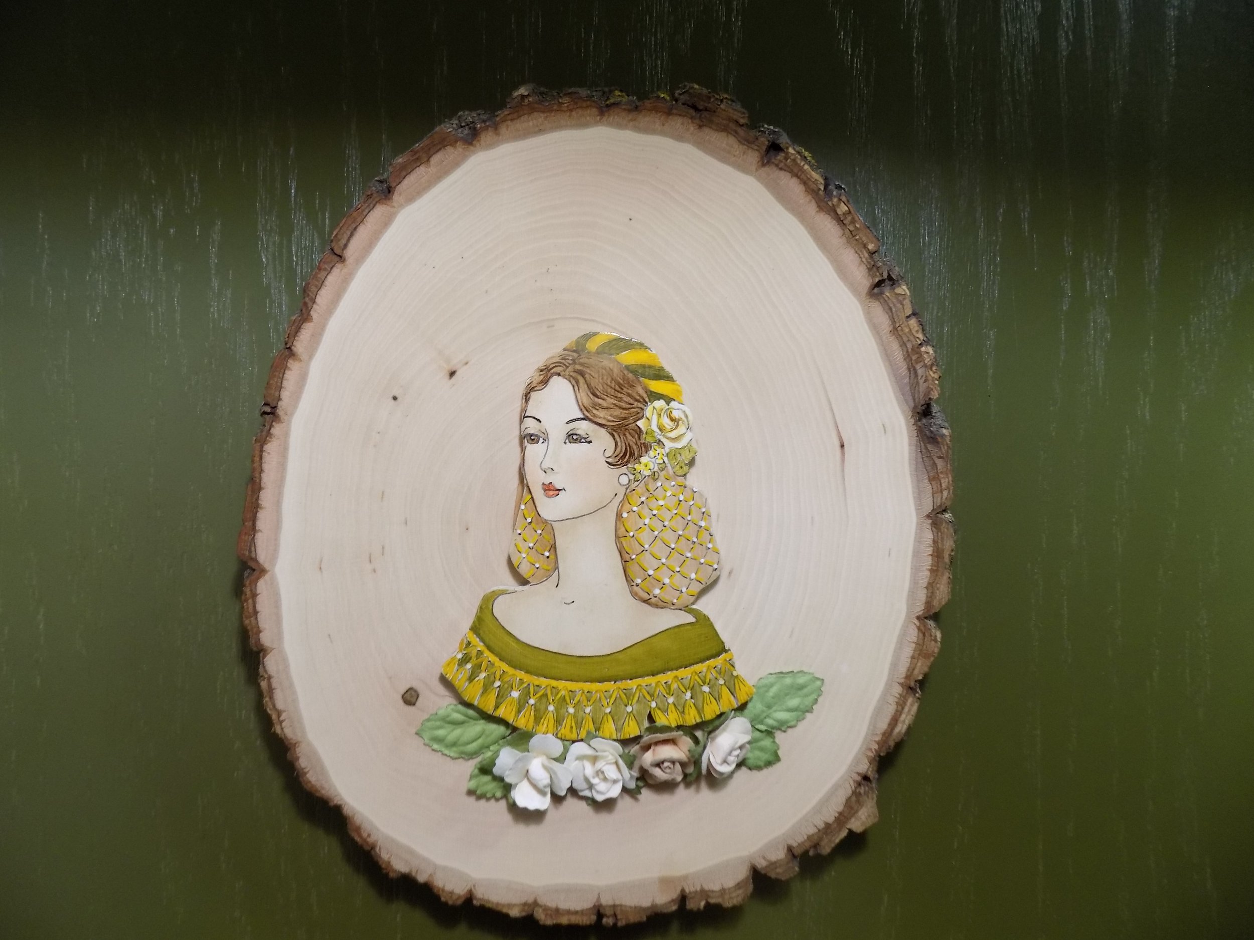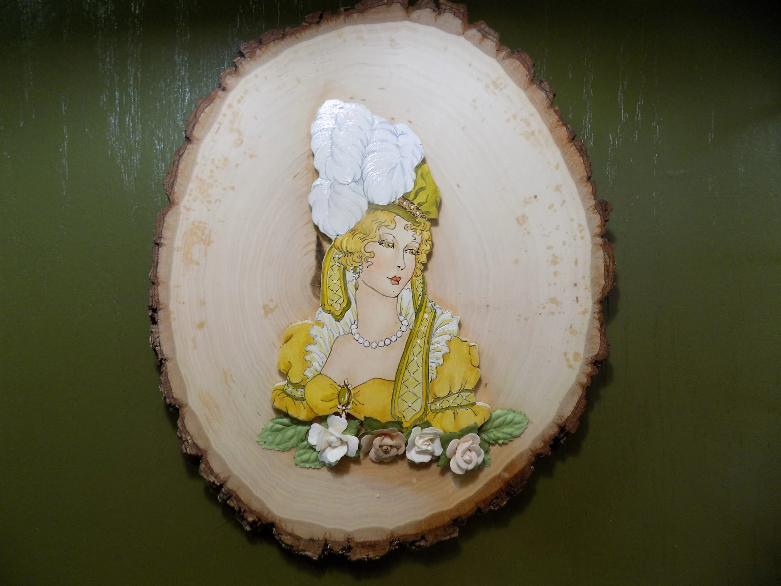 Here are more lady busts Bobbi painted in acrylic on wood cutout. I mounted it on a wood plank, and I display it in my guest bedroom.