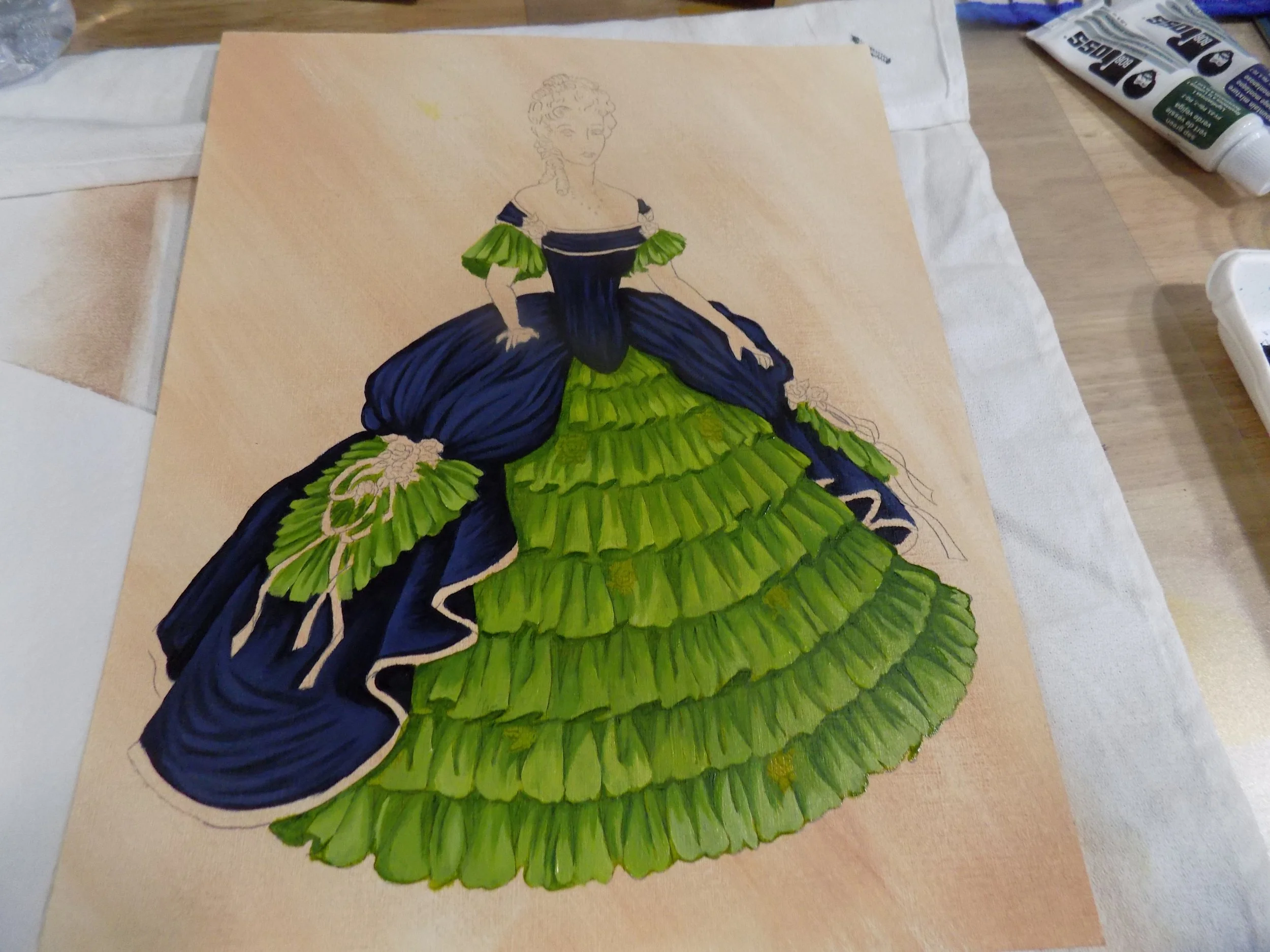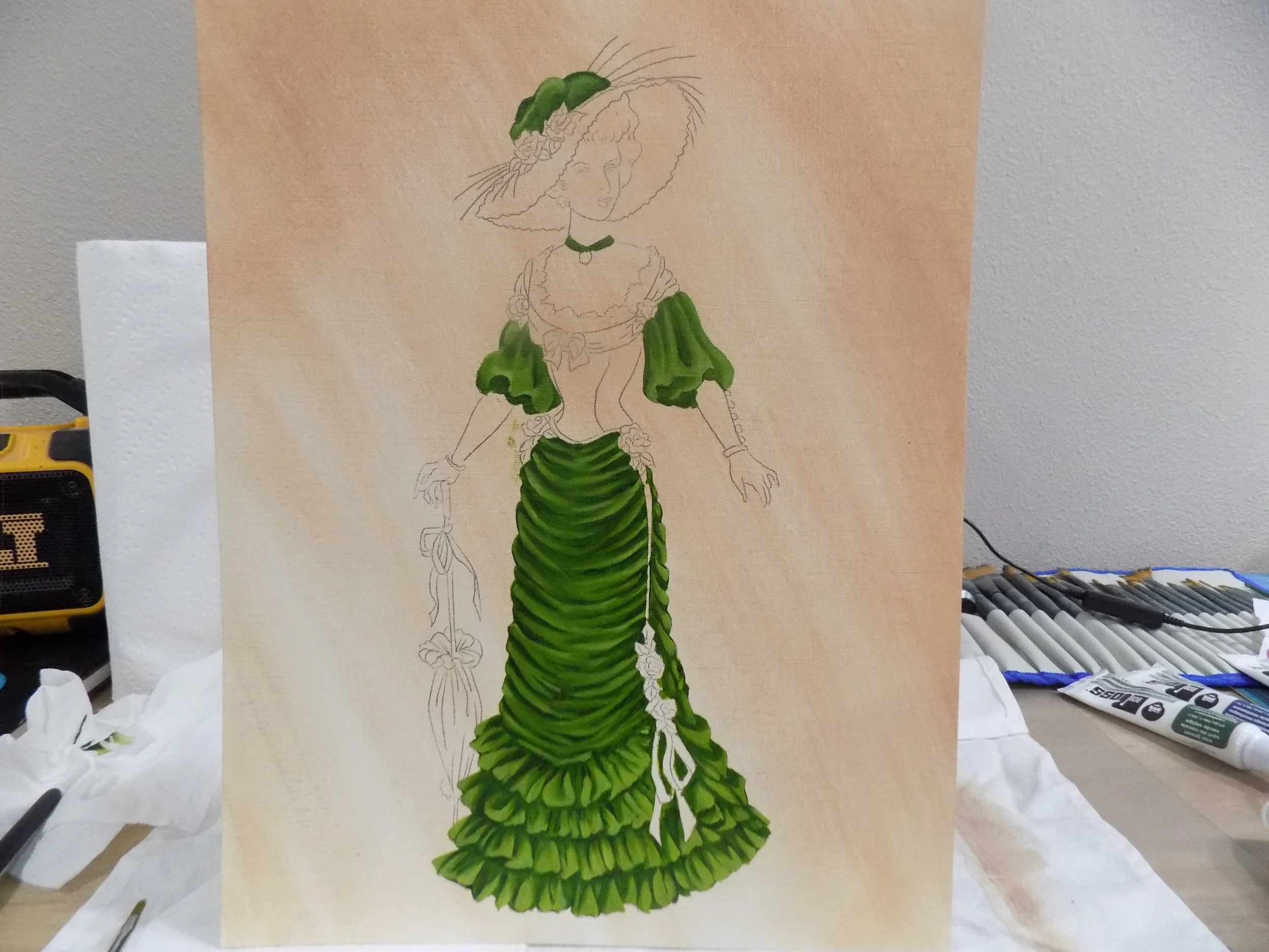 More ruffles! I’m painting these with Bob Ross Oils because, unlike Granny, I hate acrylics. Granny would have painted this lady in more muted colors. She loved pink, baby blue, and a mint green. I like to walk on the bold side with color. Think of a Peacock feather…that’s my color wheel. I usually prefer Winsor & Newton…but these are paints that my dad had left after he passed. He passed a week after Granny, and he was a Bob Ross fanatic. I’ll do an article on him and his art next. I will post some finished pics soon.