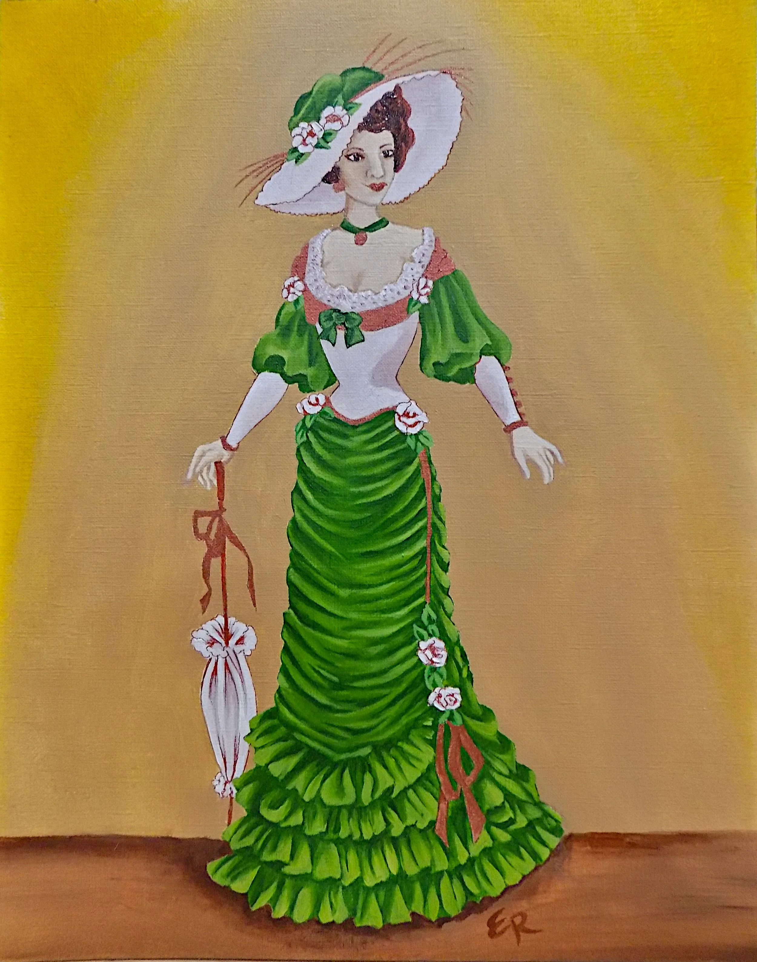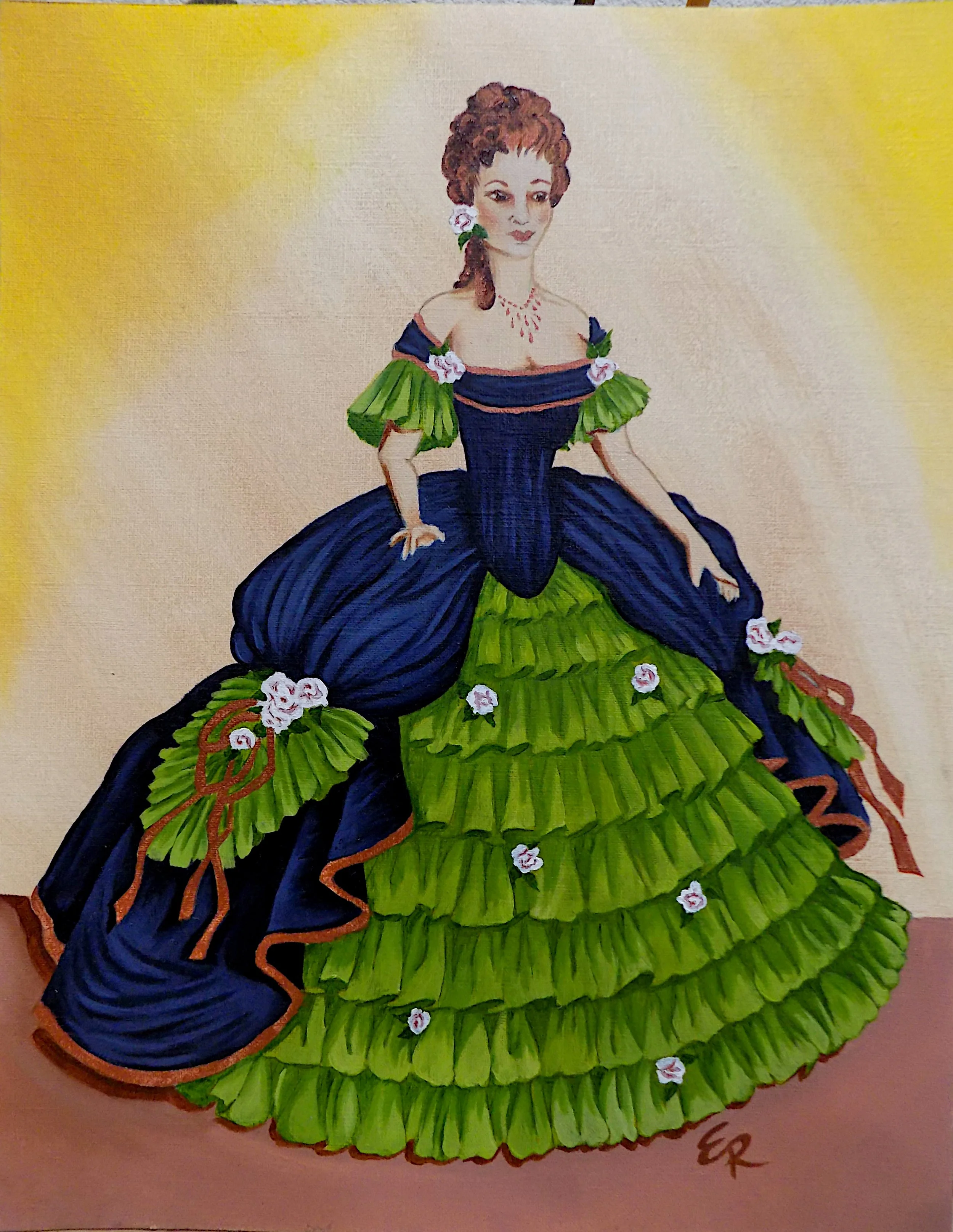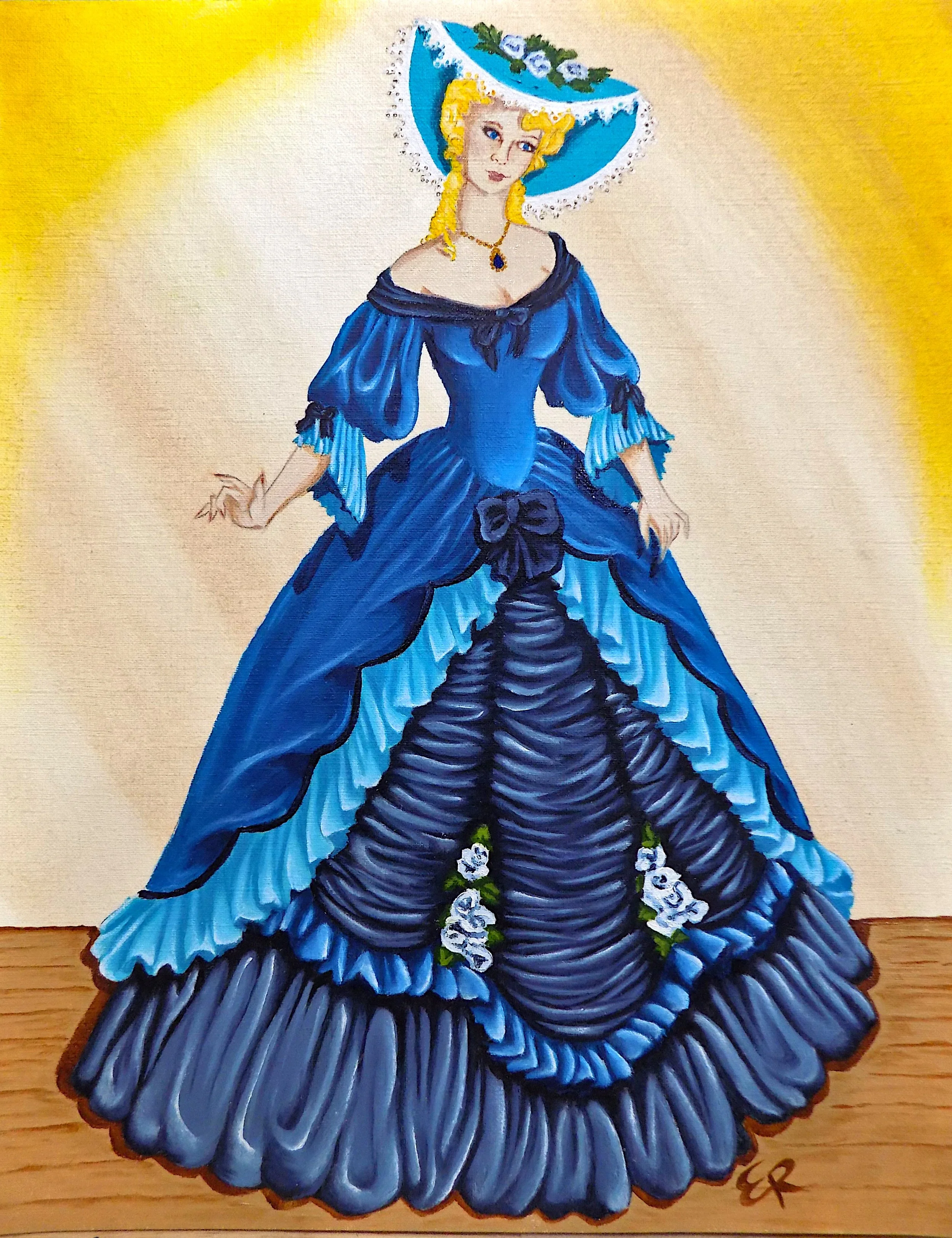 Hey folks! I have finally finished Bobbi’s ladies. They are 11x14 oil on canvas paper. I really enjoyed painting these. The ruffles were a little challenging, but I got the hang of it soon enough. Like I said before, Granny would have done these in pastel pinks and blues, but I wanted these to match my home decor. Here ya go, Enjoy!